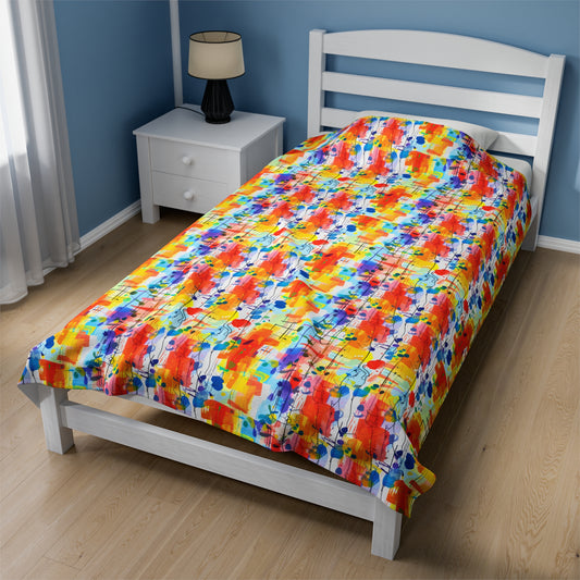 Colorful Chaos Abstract Expressionist Art with Layered Paint Stains in Vibrant Hues of Yellow, Orange, and Blue Velveteen Plush Blanket 3 Sizes