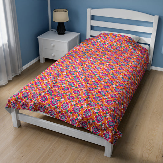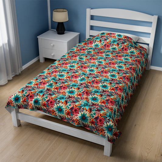 Kaleidoscope of Warm Tangerine, Lush Teal, and Lively Pink Blooms Velveteen Plush Blanket 3 Sizes
