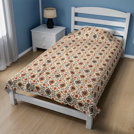 Bohemian Intricate Geometric and Floral Folk Design in Burnt Orange, Deep Brown, and Creamy Beige Velveteen Plush Blanket 3 Sizes