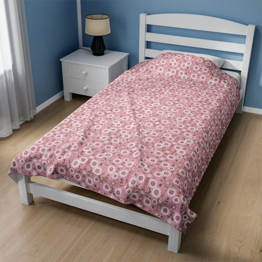 Charming Daisy Pink and White Floral Tile Pattern Velveteen Plush Blanket 3 Sizes