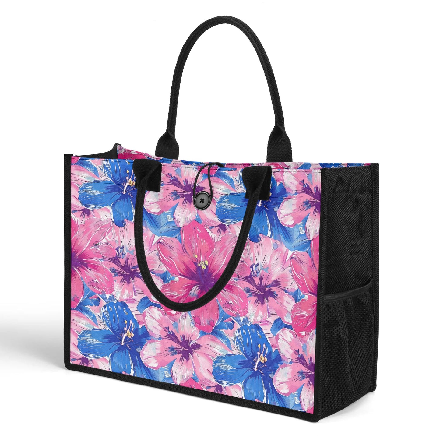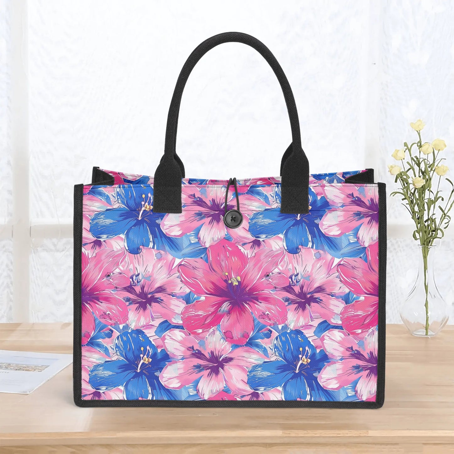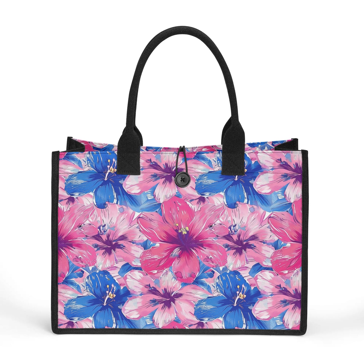 Blooming Bliss: Large Pink and Blue Blossoms in Full Bloom Structured Button Closure Canvas Tote Bag in 2 Sizes