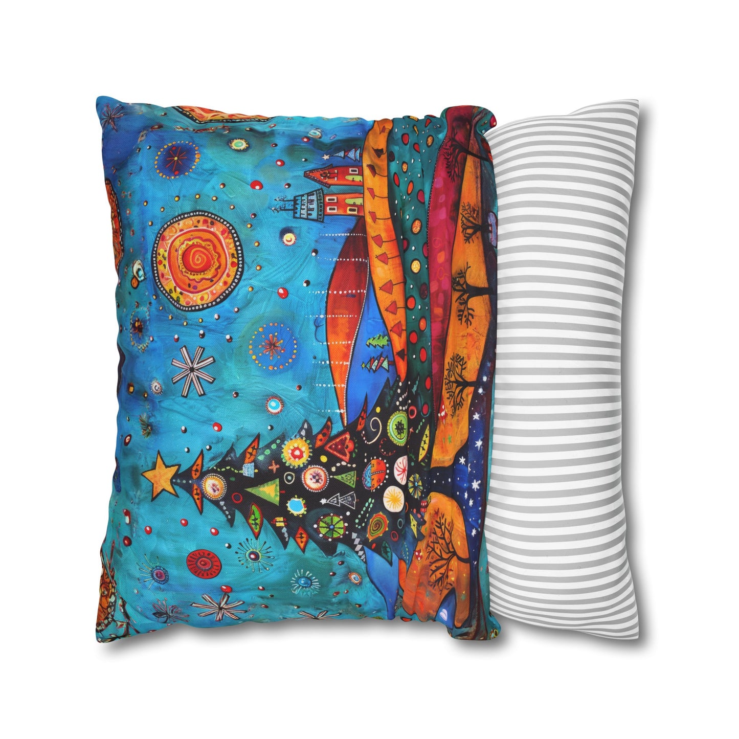 Folk Art Christmas Tree Nestled Amidst Rolling Hills Spun Polyester Square Pillowcase 4 Sizes