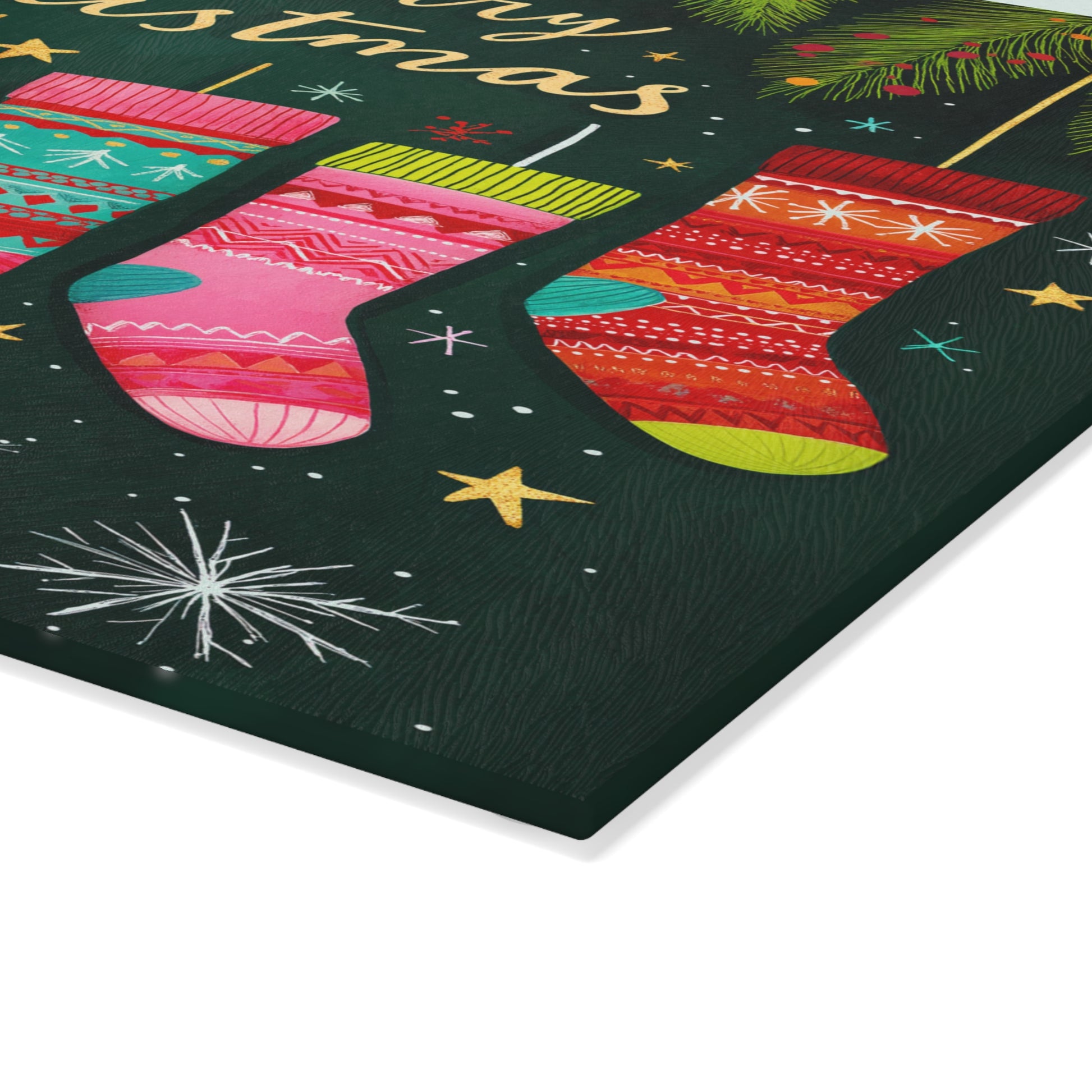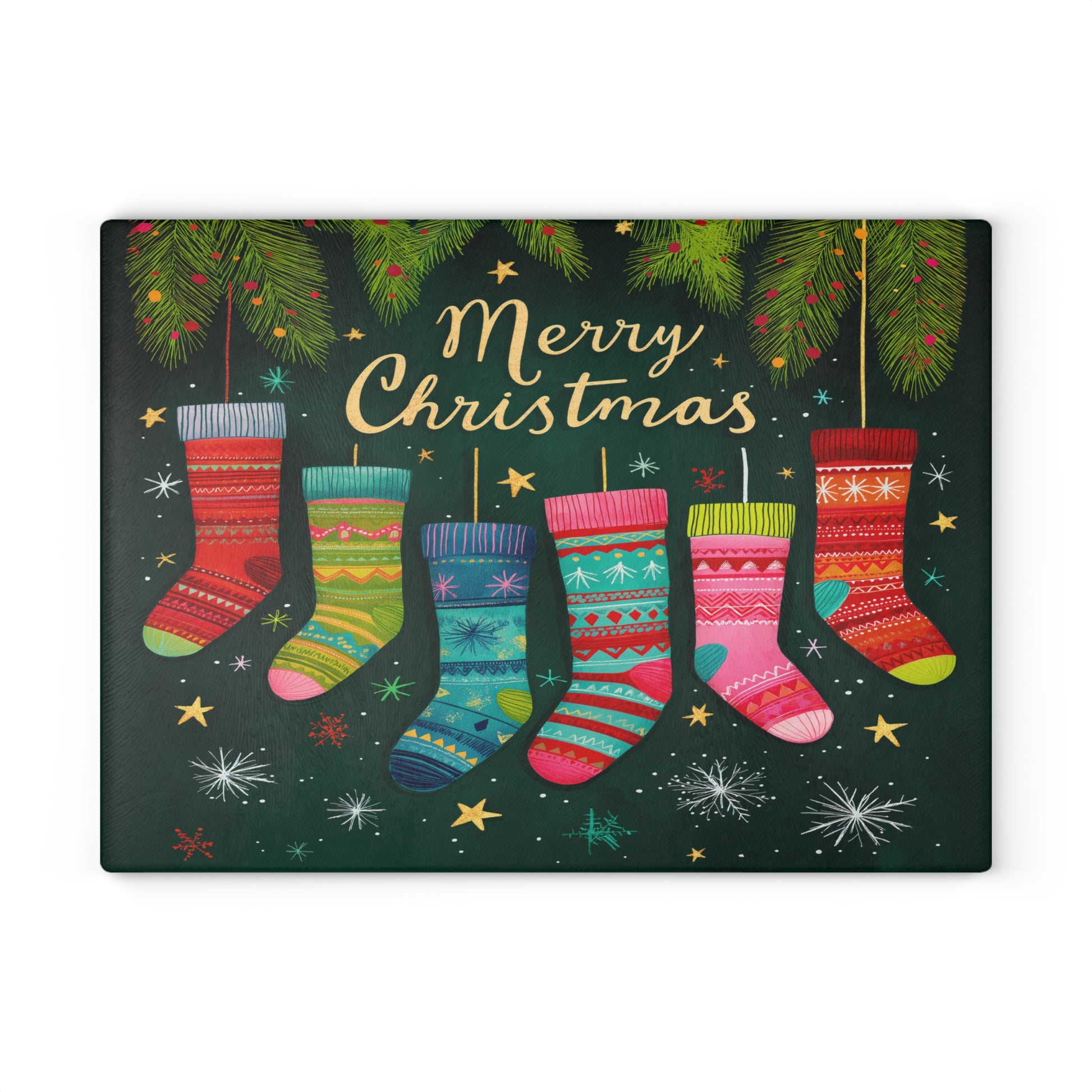 Merry Christmas Stockings Glass Cutting Board, Charcuterie Serving Tray 2 Sizes