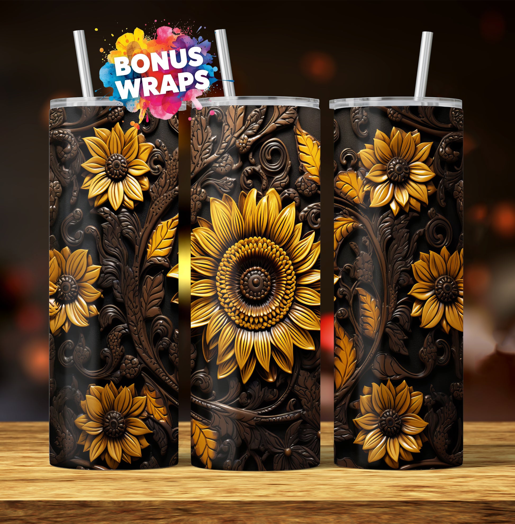 Rustic Sunflower Tooled Leather 20oz Skinny Tumbler, Seamless Sunflowers Country Western 20 oz Straight Skinny Tumbler Wrap PNG