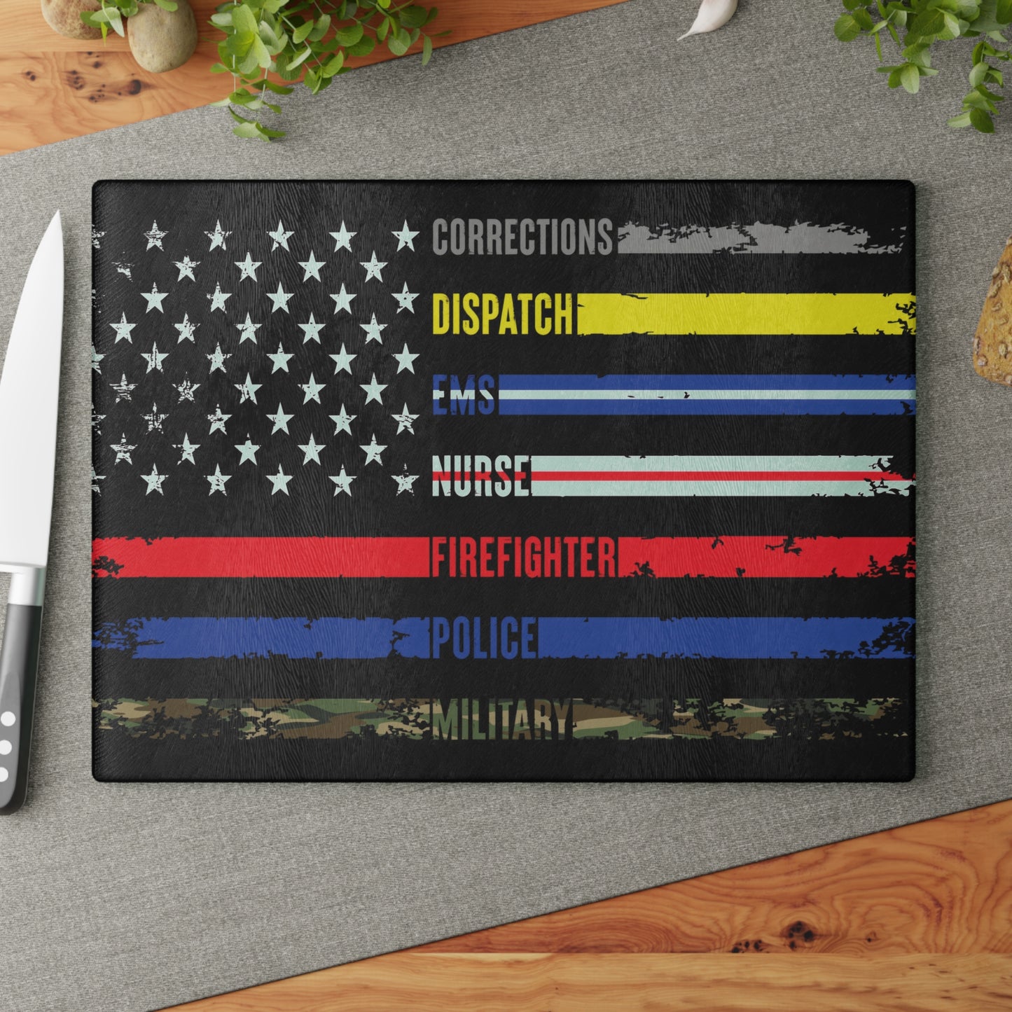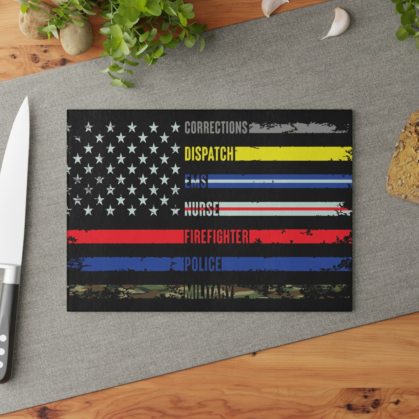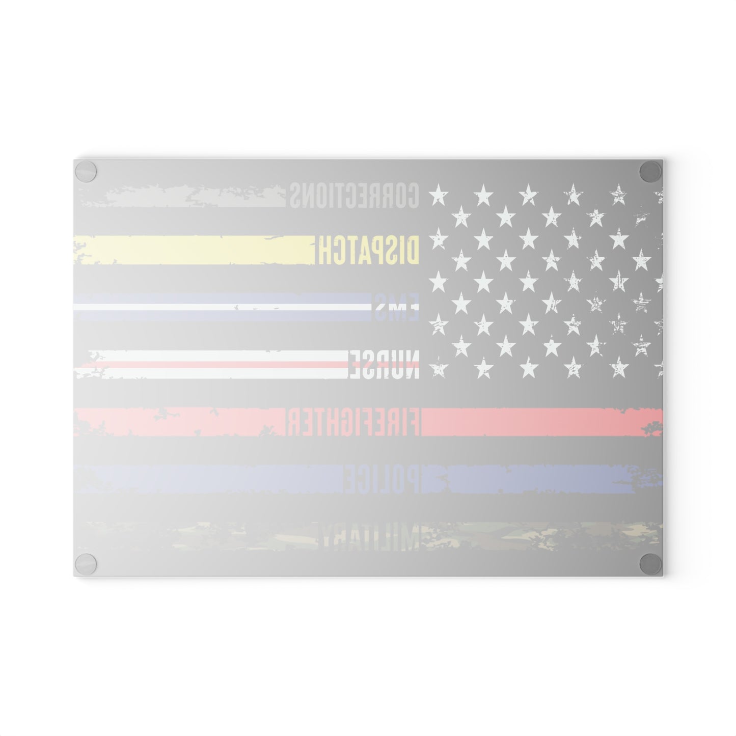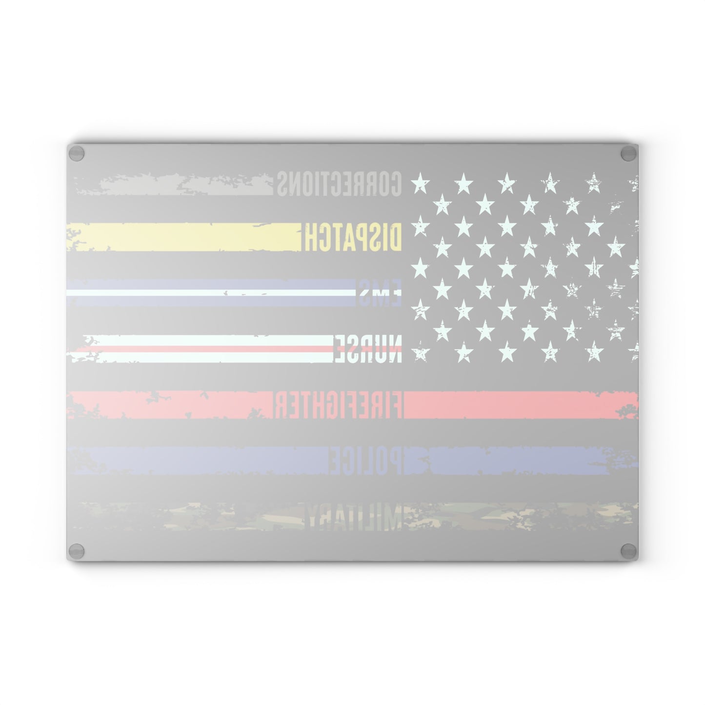 Solidarity Support Military, Police, Firefighter, Nurse, EMS, Dispatch Corrections American Flag Glass Cutting Board, Charcuterie Serving Tray 2 Sizes
