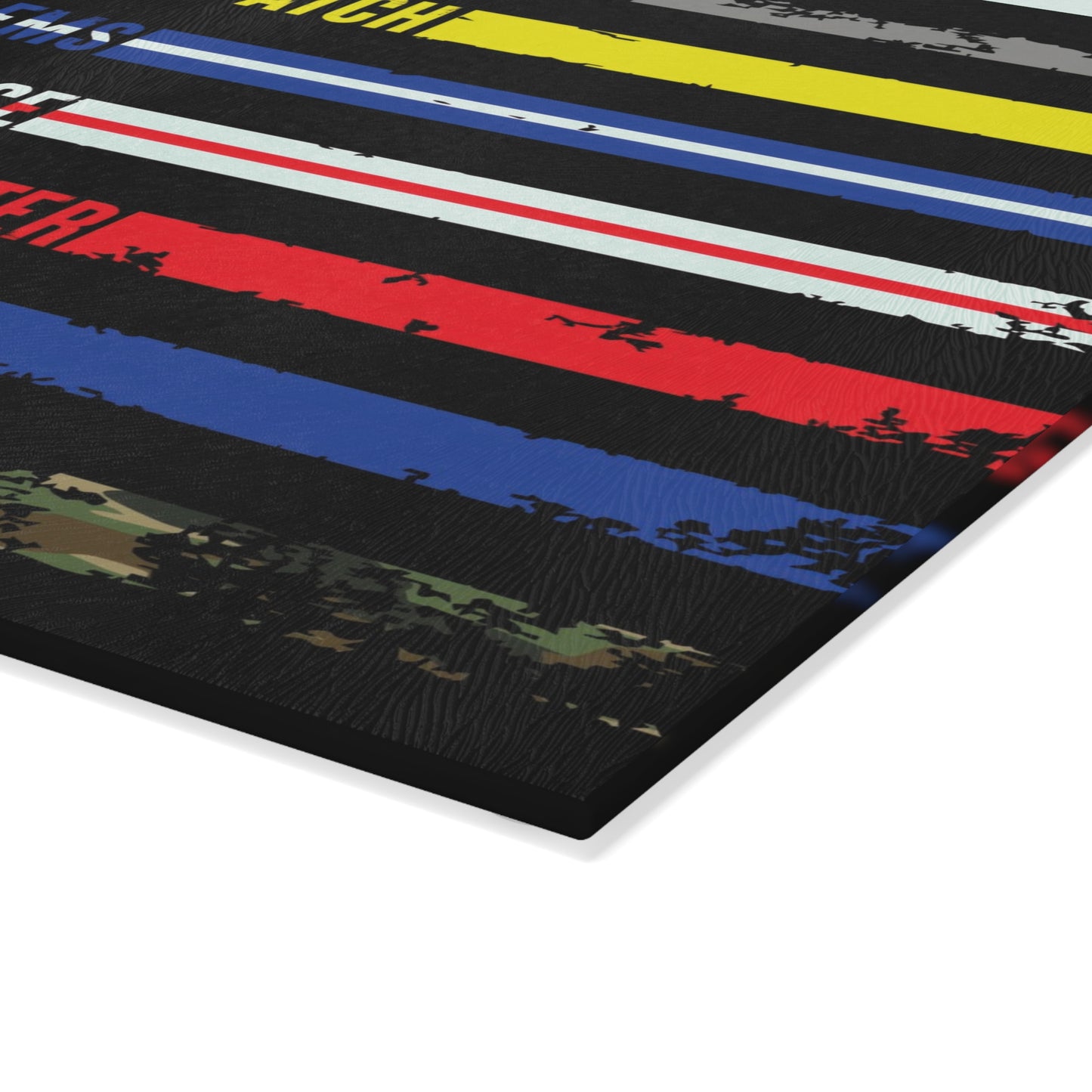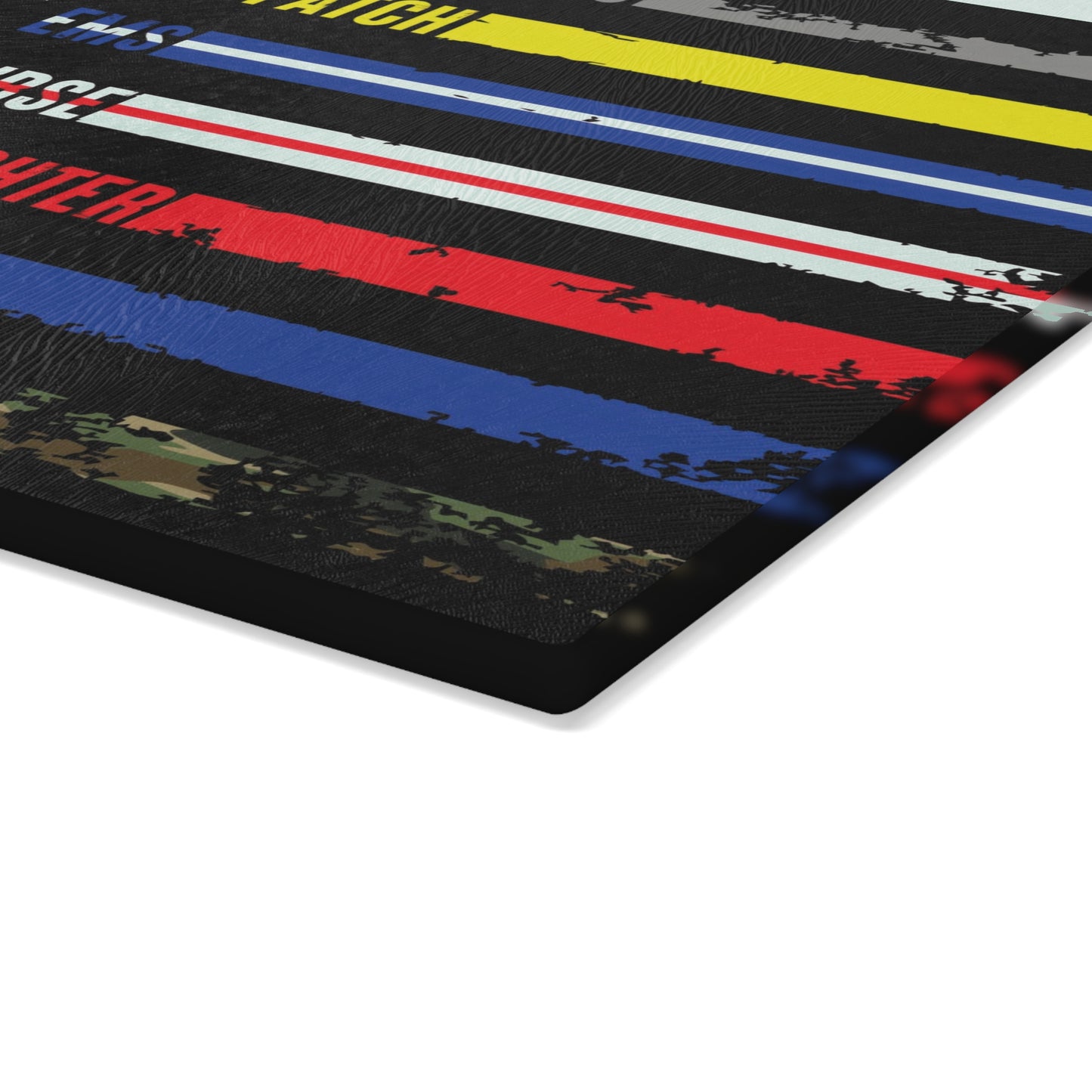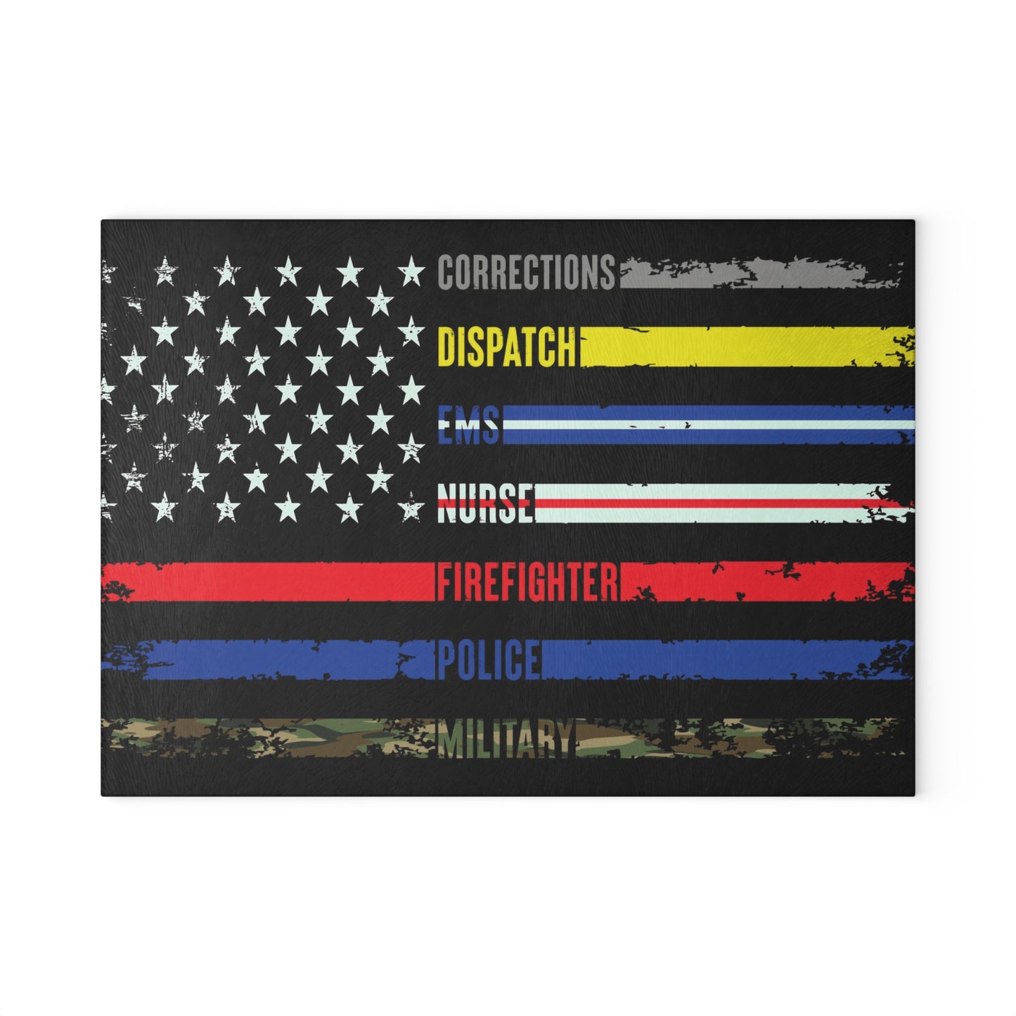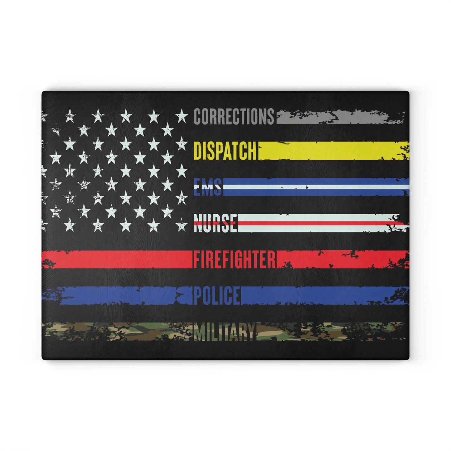 Solidarity Support Military, Police, Firefighter, Nurse, EMS, Dispatch Corrections American Flag Glass Cutting Board, Charcuterie Serving Tray 2 Sizes