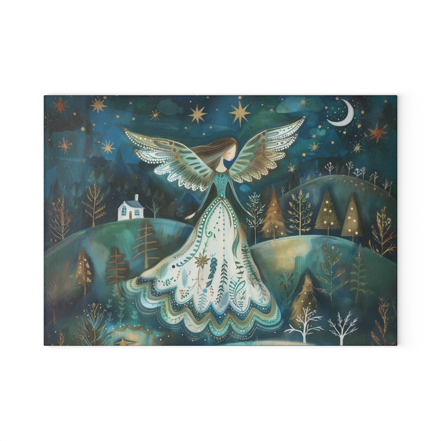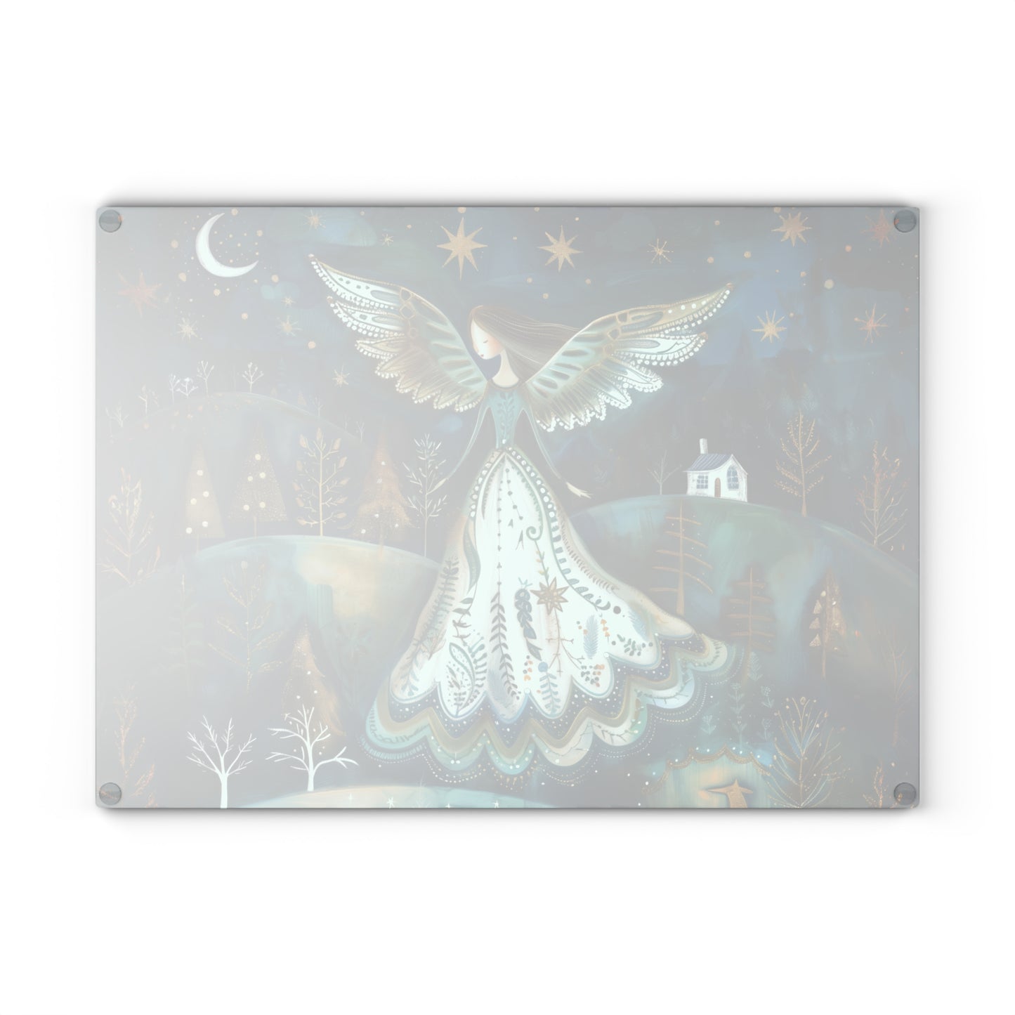 Starry Serenade: Angel in Flowing Dress Amidst a Starry Night Glass Cutting Board, Charcuterie Serving Tray 2 Sizes